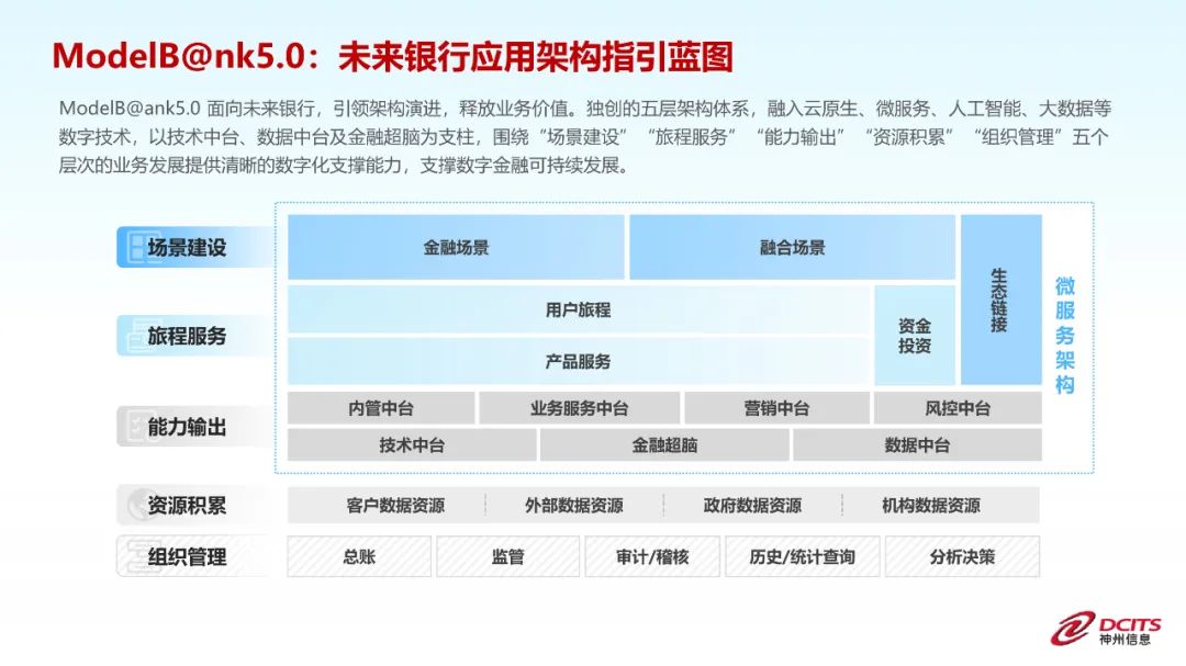 ModelB@nk5.0架构(2021年):以技术中台、数据中台和金融超脑为支柱,围绕着场景建设、旅程服务、能力输出、资源积累、组织管理五个层次的业务发展诉求,用清晰的数字化支撑能力,为金融机构IT架构演进和信创实践落地带来方向性指引。